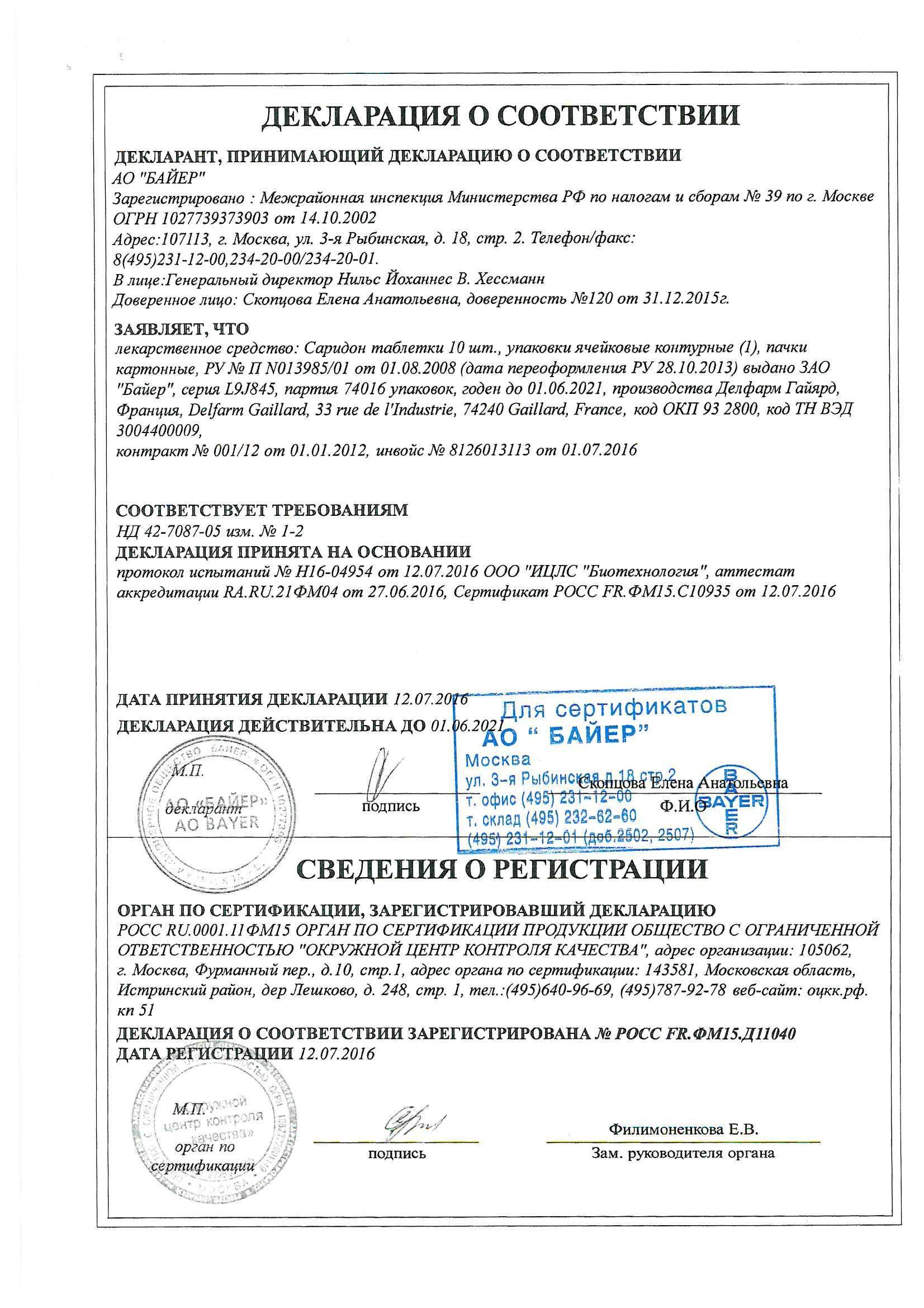 Применение. Таблетки Саридон принимают внутрь после еды. Взрослым обычно назначают по 1 таблетке 3-4 раза в сутки. Максимальная разовая доза для взрослых составляет 2 таблетки, суточная - 6 таблеток. Продолжительность приема не более 3 дней в качестве жаропонижающего средства и не более 5 дней в качестве обезболивающего средства. Для подростков от 12 до 18 лет дозировка составляет 1/2 -1 таблетки 2-3 раза в сутки.