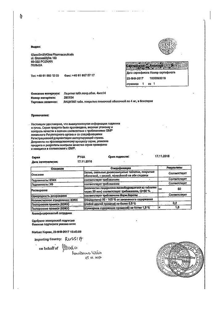 В медицинской литературе не описано случаев передозировки Лаципила.