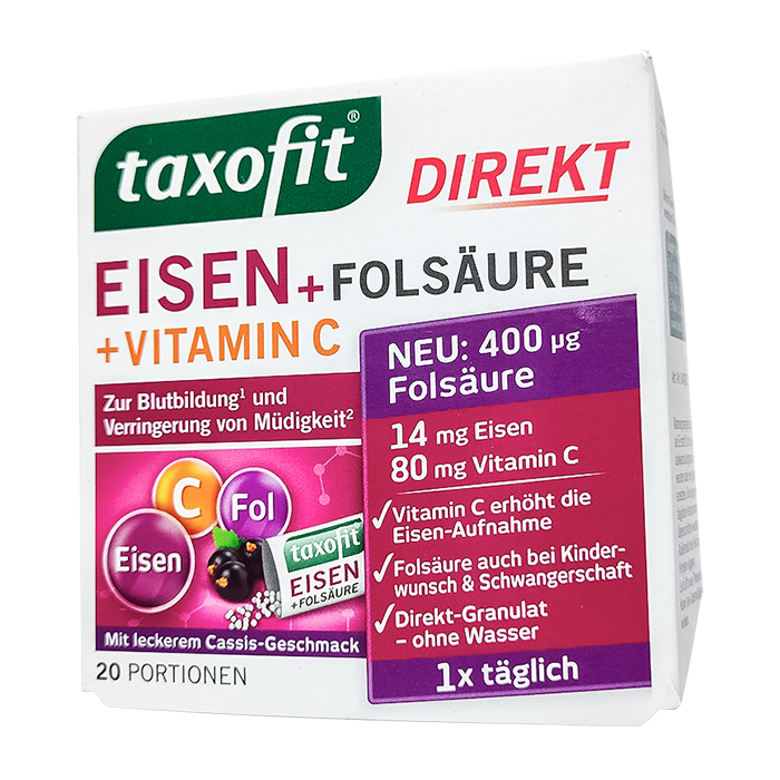 Чтобы иметь возможность использовать свой привычный потенциал на работе, в повседневной жизни или в спорте, вам следует придерживаться сбалансированной диеты и обеспечивать достаточное количество железа. Таксофит железо + фолиевая кислота в виде прямых гранул позволяет легко и быстро дополнить рацион железом и фолиевой кислотой. Премиальная фолиевая кислота Metafolin в биоактивной форме особенно проста в использовании. Специально отобранные ингредиенты используются для кроветворения, транспорта кислорода и энергетического обмена, чтобы справляться с повседневными проблемами.